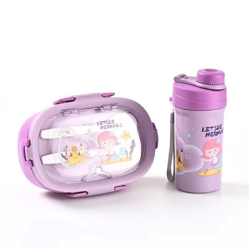 Boîte à Lunch et Bouteille d’Eau pour Enfants – 2 Compartiments, Motif Dessin Animé, Sans BPA, Micro-ondes Compatible