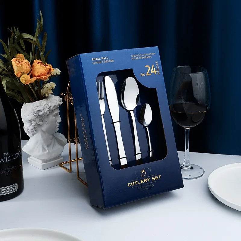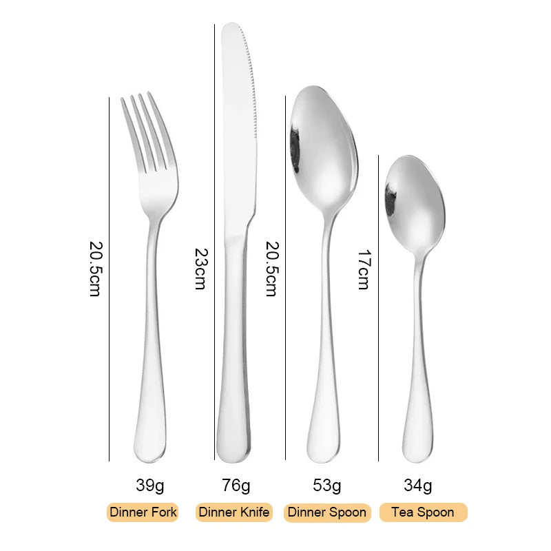 Complet et pratique : L'ensemble comprend 24 pièces, avec des cuillères et des fourchettes parfaitement équilibrées, conçues pour offrir une prise en main confortable et un usage optimal lors des repas. Ce service est idéal pour accueillir vos invités et rendre chaque repas plus spécial.