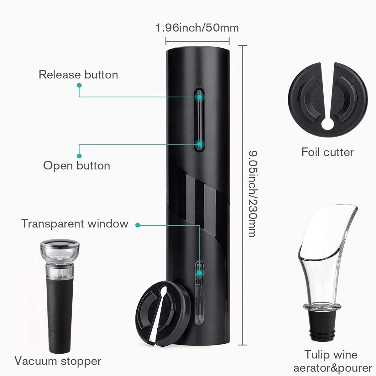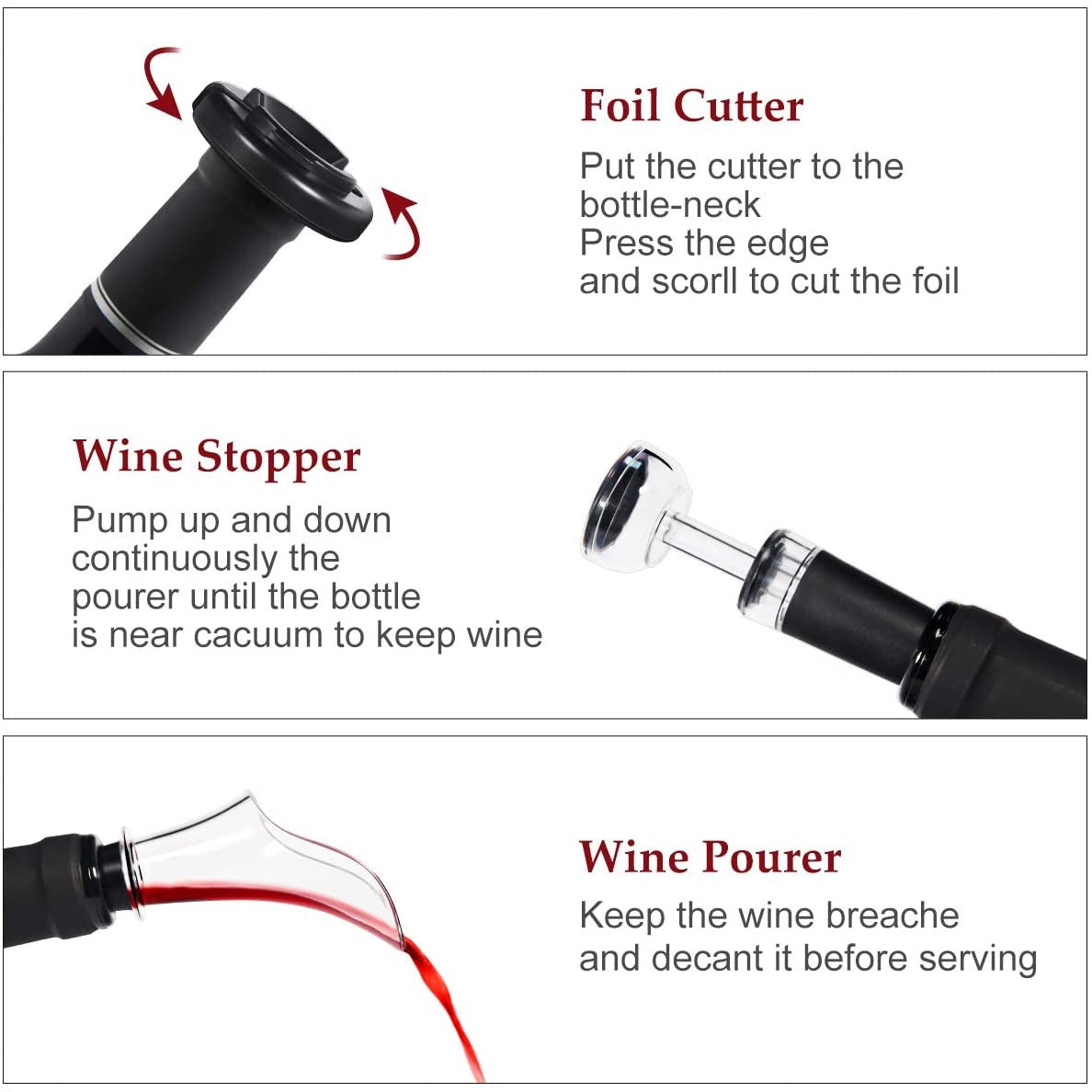 Contient un ouvre-vin, un aérateur verseur, un bouchon sous vide et un coupe-feuille.