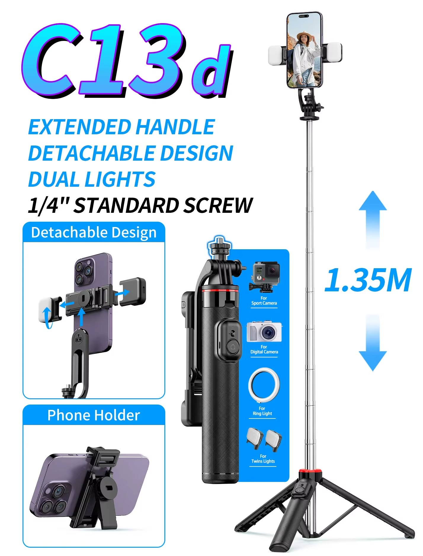 Ce produit combine intelligemment une perche à selfie extensible et un trépied stable, vous permettant de passer du mode photo en mouvement à une prise de vue fixe en quelques secondes. Parfait pour les selfies, les vlogs, les appels vidéo, les lives ou les plans fixes en extérieur.